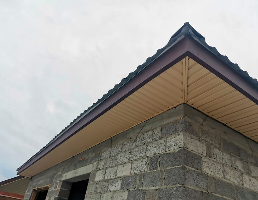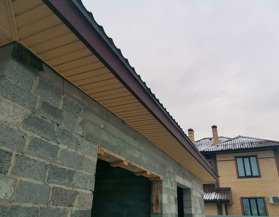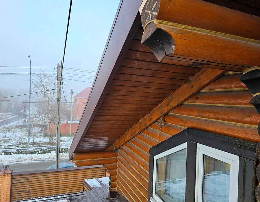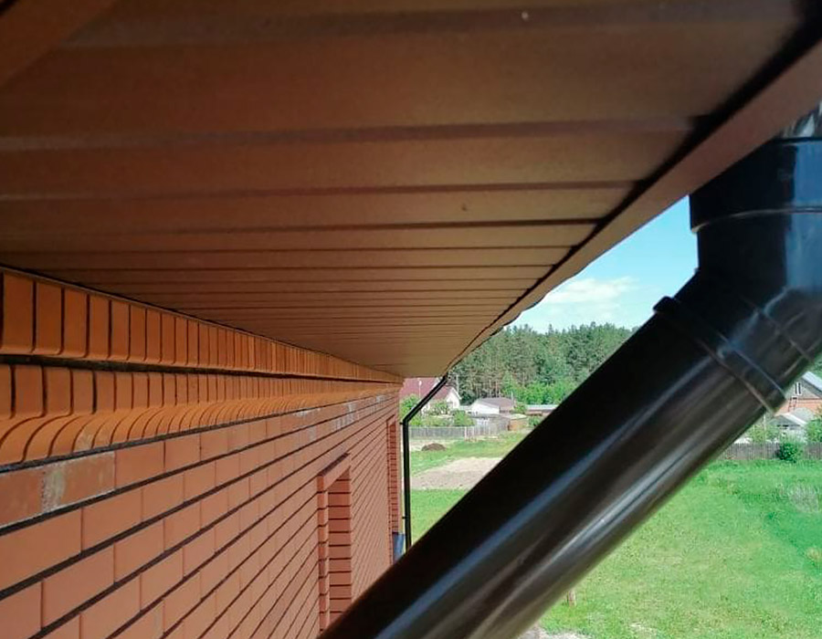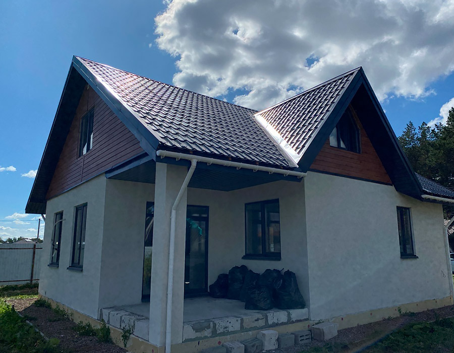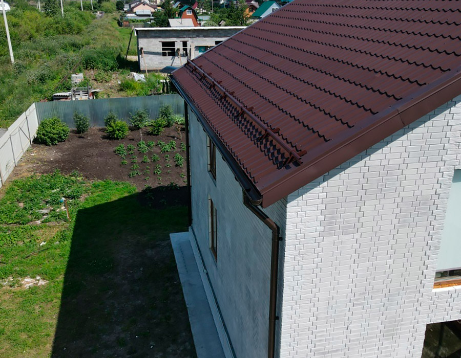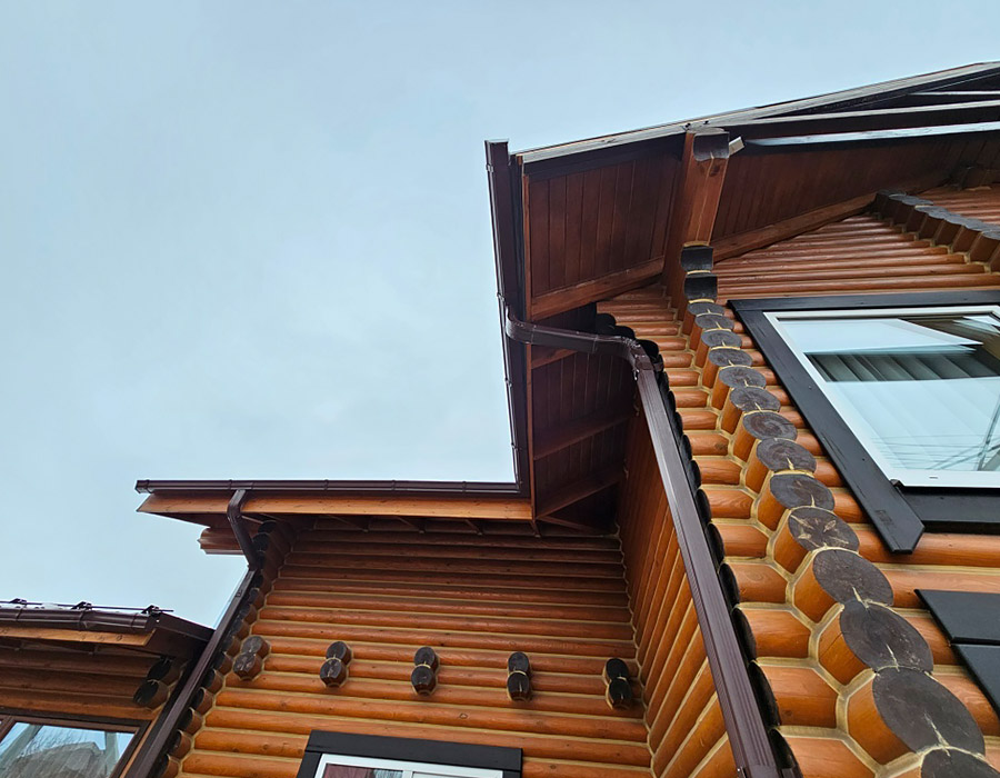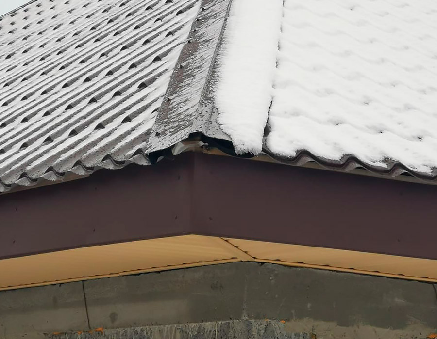 - Обязательный подшив свесов, монтаж водостока, снегозадержателей, дымохода;
